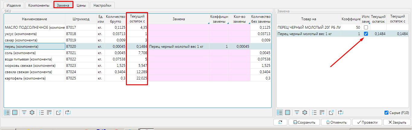 На вкладке Замена отображаются остатки компонентов с учетом настроенных замен. При необходимости использовать замену,  галочкой надо указать, какой именно  товар замены использовать, этот товар будет в дальнейшем использован для калькуляции стоимости.