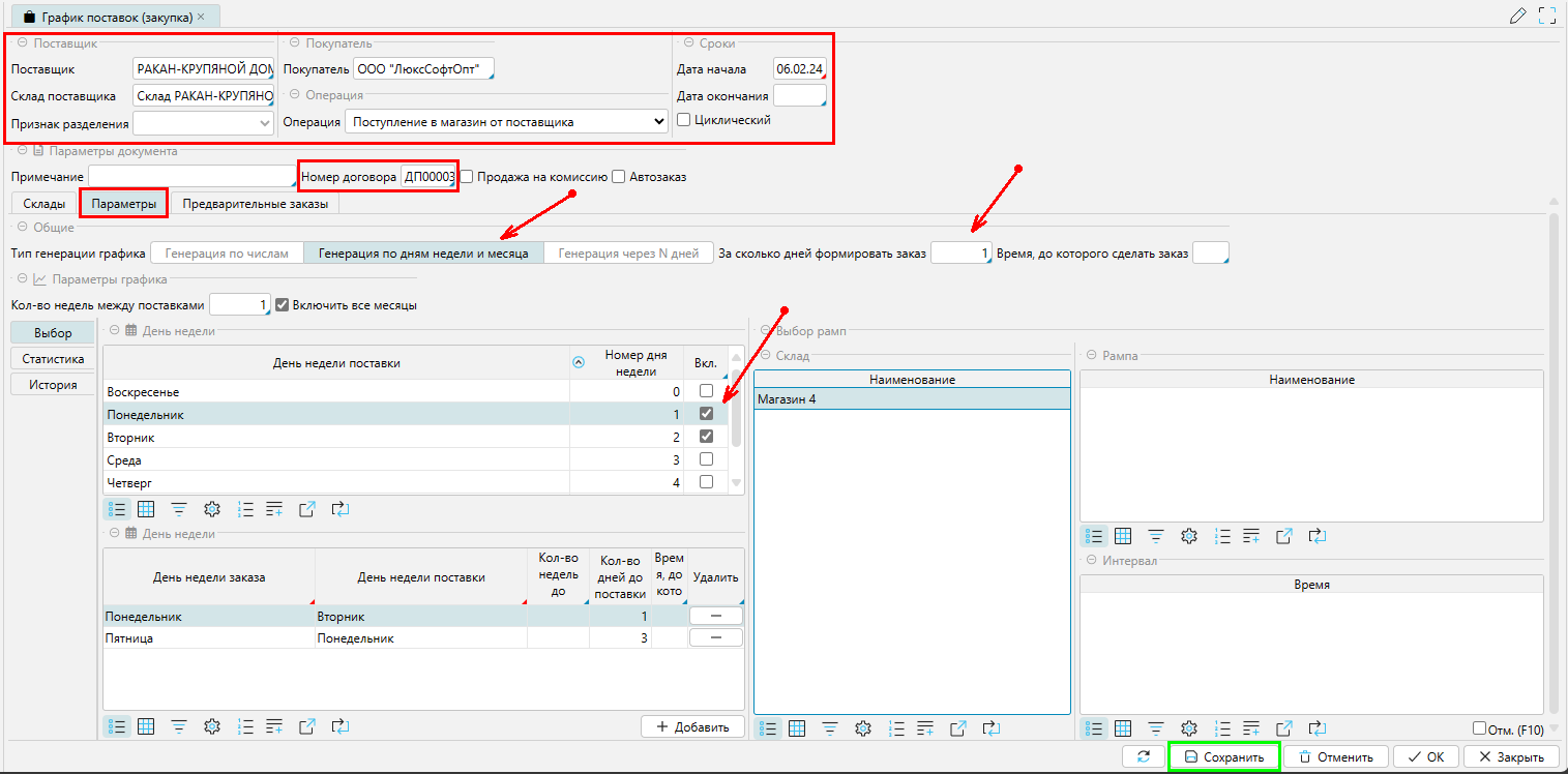 • При необходимости, для магазина можно указать номер рампы и время для разгрузки - блок Выбор рампы.