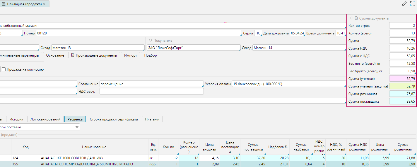 Проверяем суммы документа в правом верхнем углу формы.