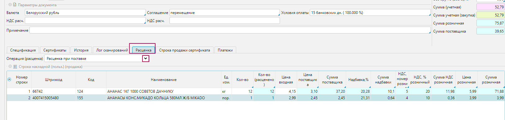 Вкладка Расценка, отображается если ранее в Производных документам был проставлен признак "Создать акт расценки". Проверяем формирование цены, операцию расценки, при необходимости, можно вручную поменять операцию