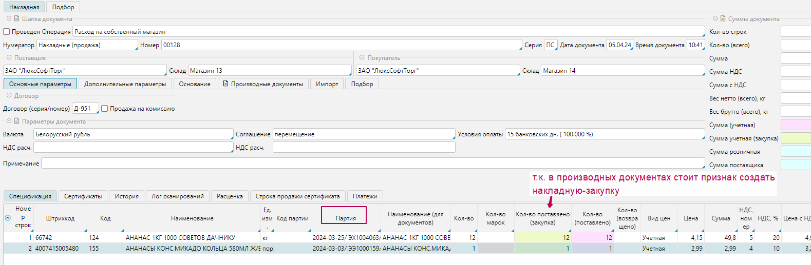 - в строках спецификации заполняем Партию, при необходимости, проверяем заполнение данных, при проставленных галочках порождения накладной -закупки видим значения в колонке -закупки