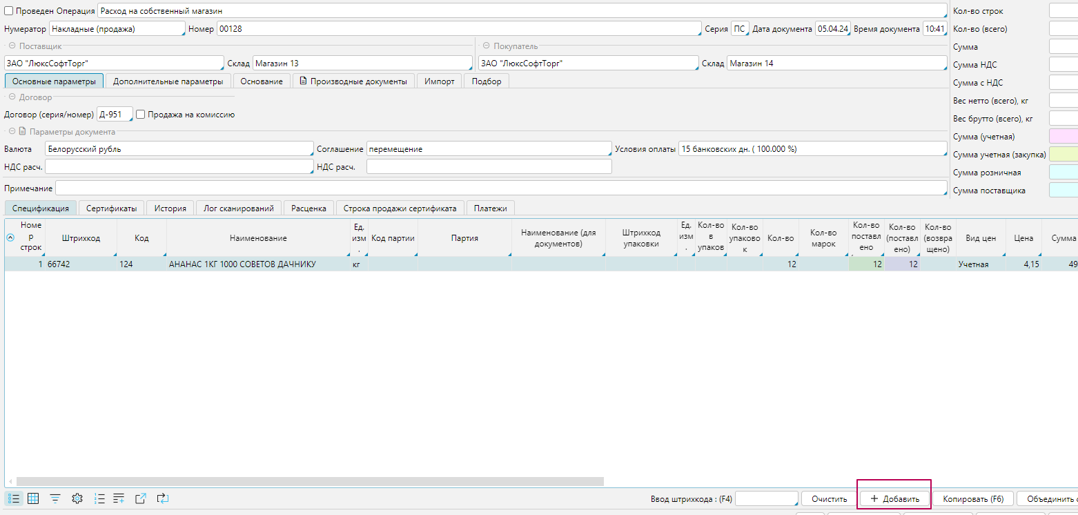 Создаем накладную и заполняем шапку.
