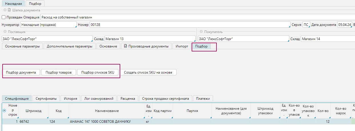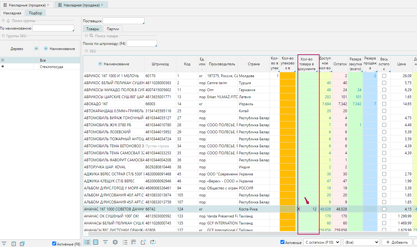 - в шапке накладной перейти на вкладку Подбор и проставить нужное количество для отпуска в колонке "Кол-во товара в документе" или в колонке "Кол-во упаковок в документе". Для того, чтобы заполнить количество в документе количеством текущего остатка, необходимо поставить галочку "Весь остаток".