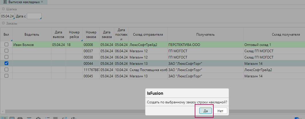 На вопрос "Создать по выбранному заказу строки накладной?" нажимаем "Да"