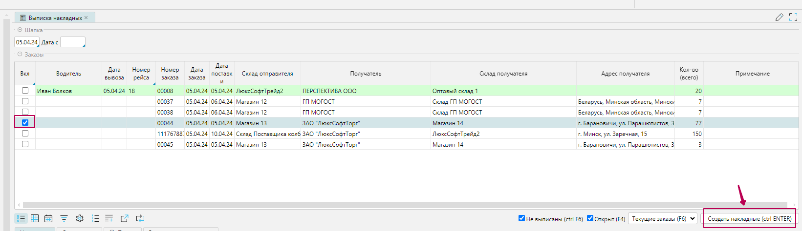 Находим нужный заказ, ставим ему признак "Вкл". Нажимаем кнопку "Создать накладные", на вопрос "Создать по выбранному заказу строки накладной?" нажимаем "Да"