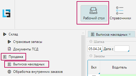 Модуль Рабочий стол/ раздел Продажа / форма Выписка накладных