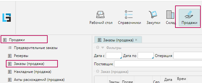 Модуль Продажи / раздел Продажи / форма Заказы(продажа)