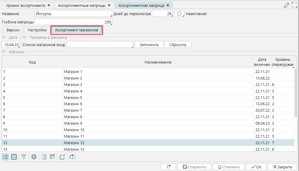 На вкладке Ассортимент магазинов отображается, какой уровень ассортиментной матрицы назначен для каждого магазина.