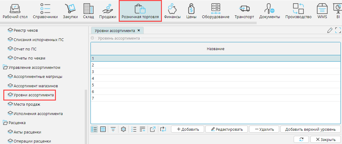 Максимальное количество уровней и их название задается на форме  Розничная торговля - Управление ассортиментом - Уровни ассортимента