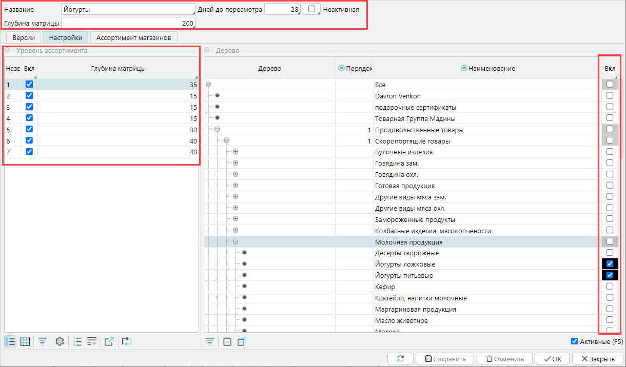 Рис. 2  Настройки ассортиментной матрицы