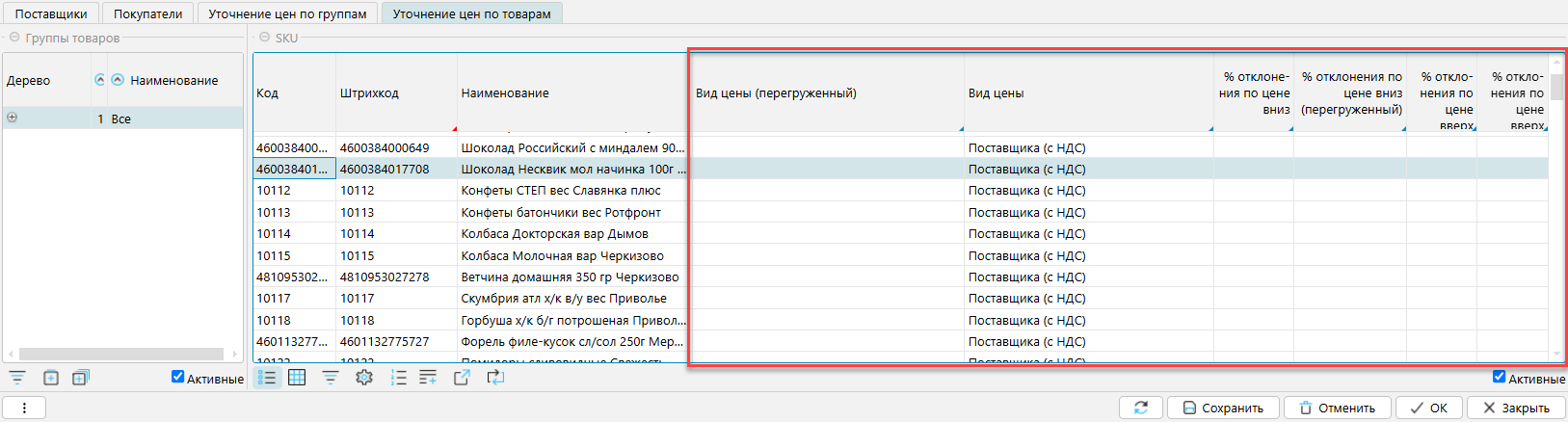 - по каждой группе можно задать допустимый процент отклонения цены в сторону увеличения или уменьшения. Результирующее отклонение, которое применяется, указывается в столбце (перегруженный)