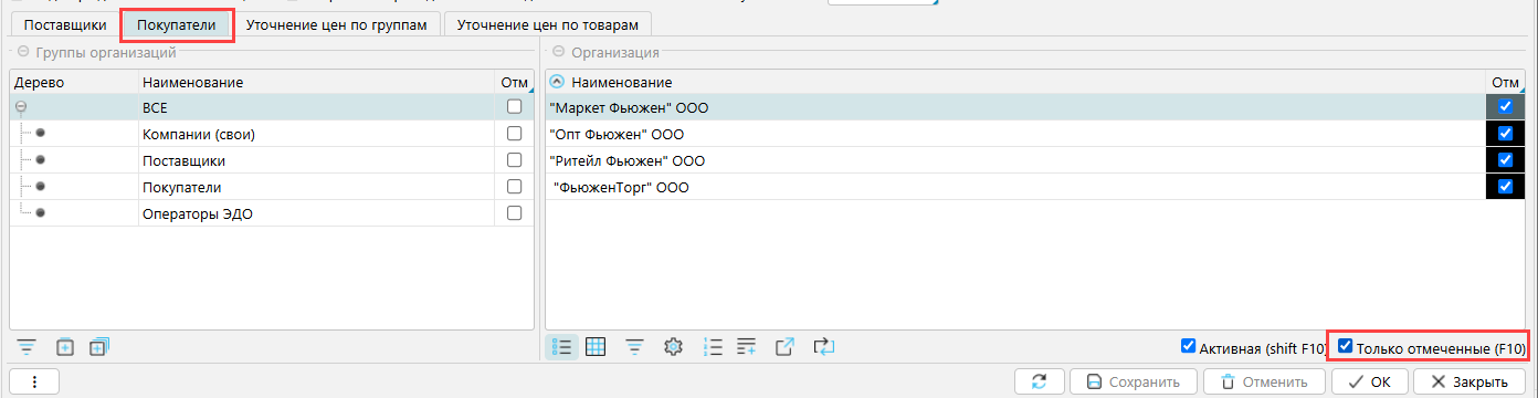 На вкладках можно выбрать или всю группу организаций сразу, или отдельные организации. Чтобы отобразить только указанные организации, например, для проверки, все ли организации включены, можно использовать фильтр Только отмеченные.