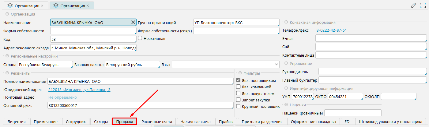 В открывшейся карточке Организации переходим во вкладку Продажа, если создаем соглашение с поставщиком, или на вкладку Закупка, если создаем соглашение с покупателем.