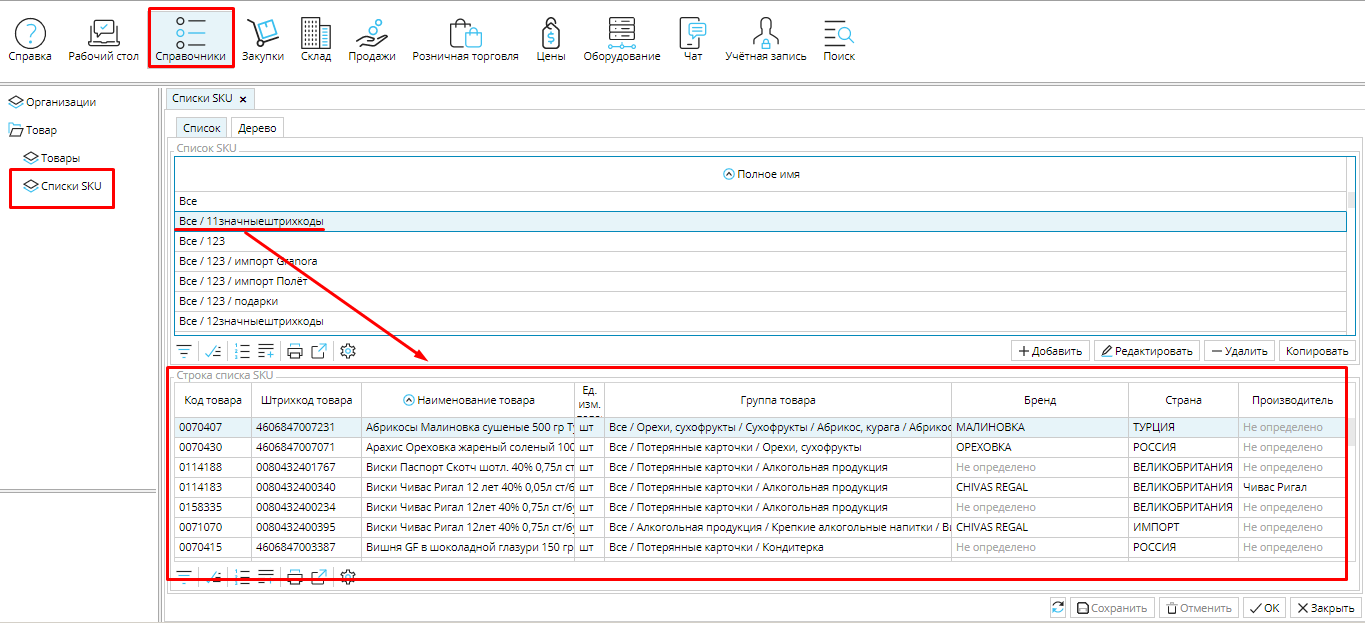 Просмотреть существующие списки SKU можно на форме Справочники - Товар/Списки SKU