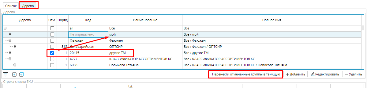 Списки SKU могут иметь иерархическую структуру. Она видна при просмотре списков на вкладке Дерево. В иерархическом представлении в блоке Строка списка отображаются товары выделенного и вложенных списков.
