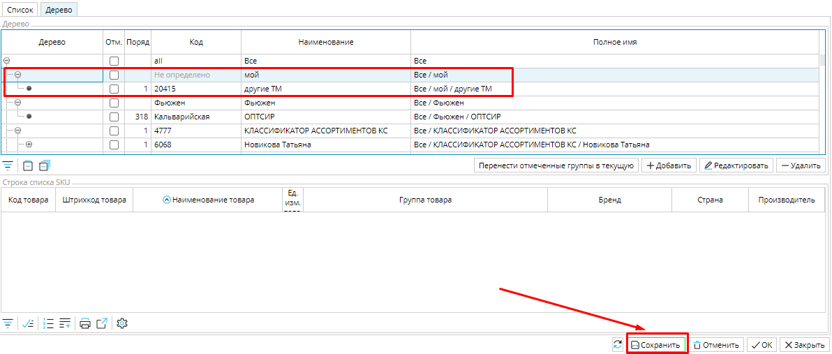 Все изменения, сделанные в иерархии списков SKU, необходимо Сохранить, чтобы они были применены.