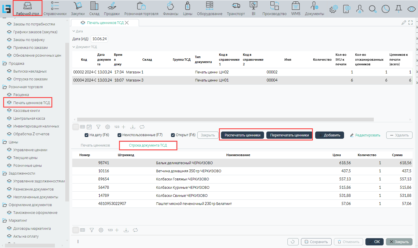 Документы из ТСД автоматически попадают на форму Рабочий стол - Печать ценников ТСД. Для печати ценников, необходимо стать на нужный документ, нажать кнопку Распечатать ценники или Перепечатать ценники.