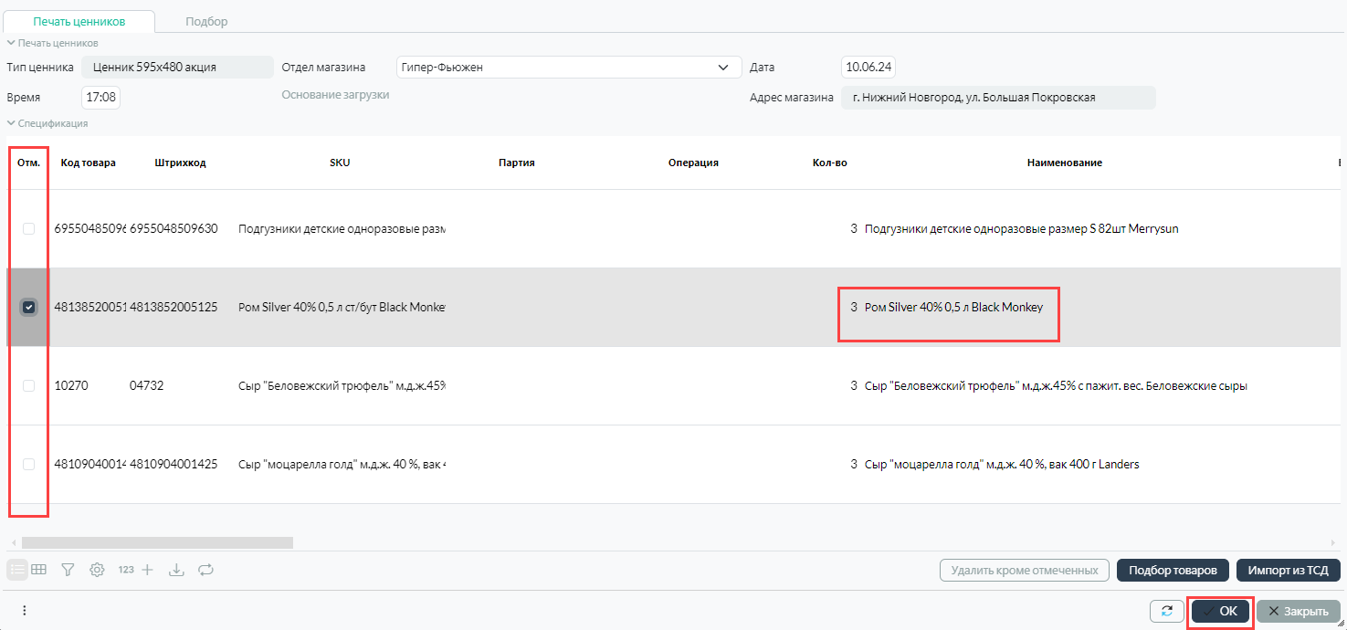Необходимо отметить галочкой те товары по которым необходимо распечатать ценники.