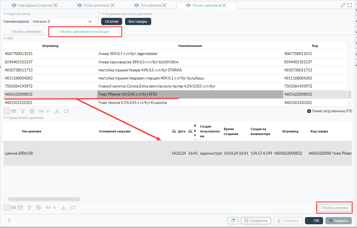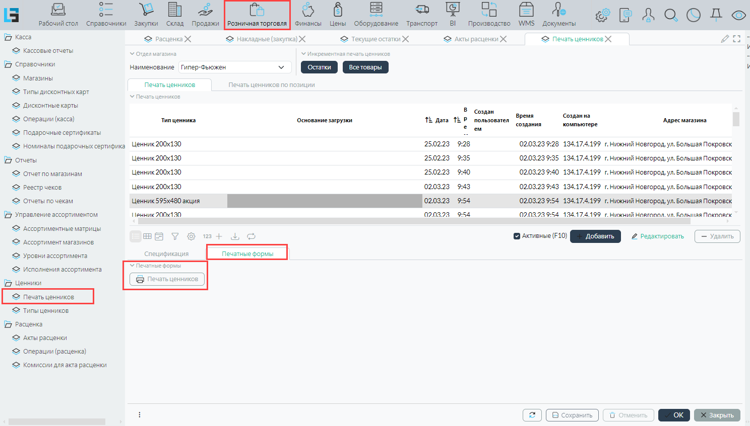 Здесь можно найти и повторить печать ценников по определенному документу или произвольному списку, созданному пользователем.