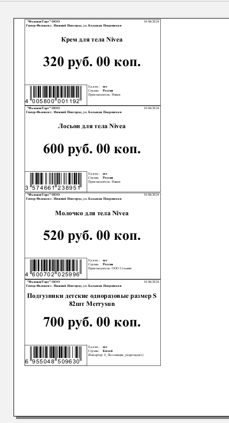 Откроется страница с ценниками на те товары, которые проведены в документе.