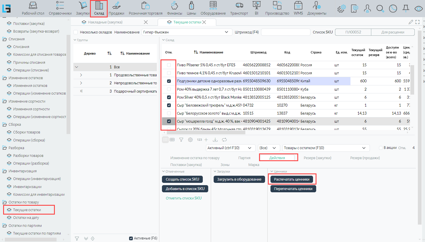 Осуществляем Печать ценников из формы Склад - Текущие остатки.