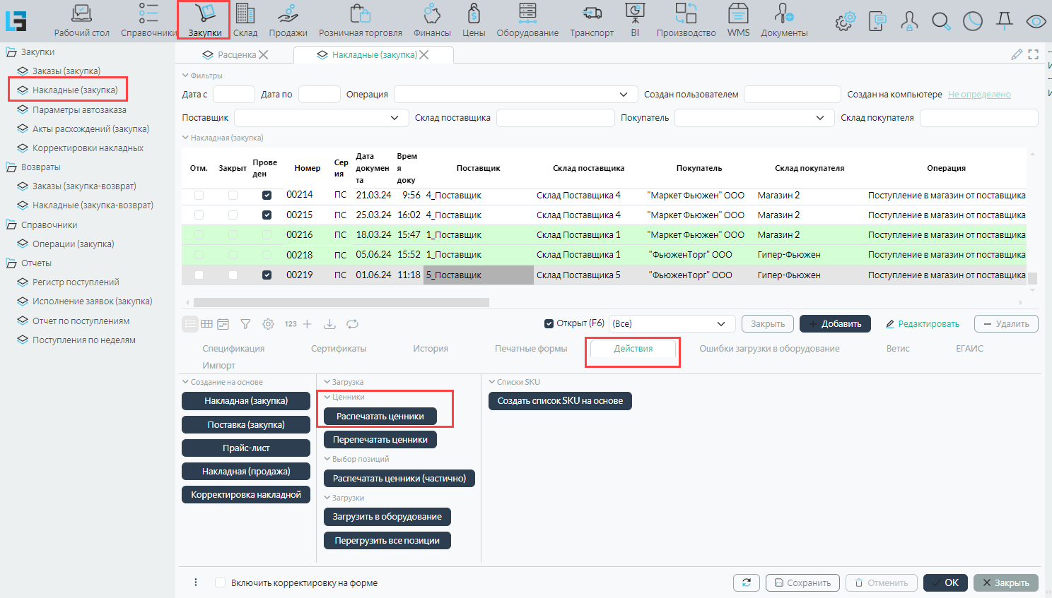 Производим Печать ценников из формы Закупки - Накладные (Закупка).