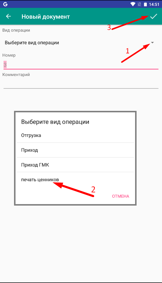 Создать документ: перейти в меню Документы, создать новый документ, выбрать операцию **Печать ценников **