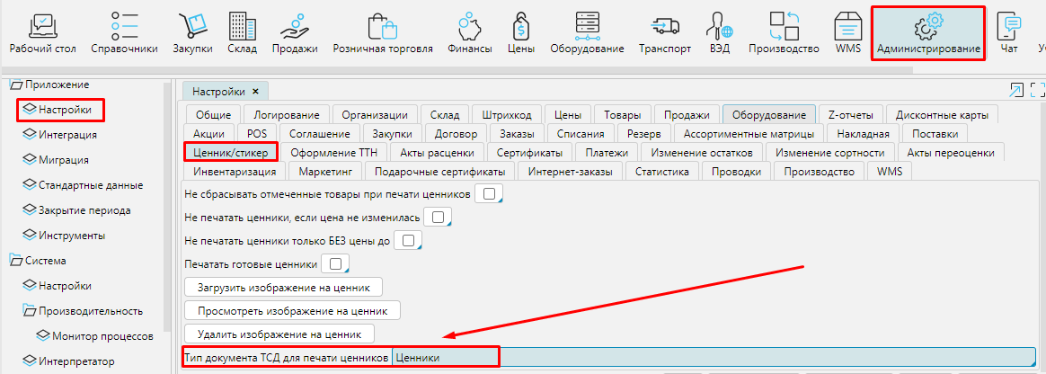 В Администрирование-Настройки- Ценник/стикер необходимо указать тип документа ТСД, который будет использоваться для печати ценников.