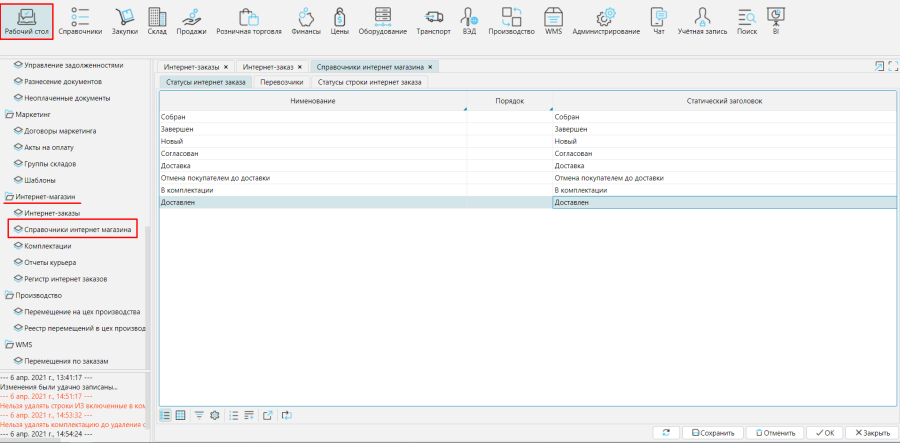 На форме Рабочий столСправочники интернет-магазина можно просмотреть статусы интернет-заказов и строк интернет-заказов. На каждом этапе работы с интернет-заказом изменяется статус его строк и на этом основании статус заказа. Статусы в основном изменяются автоматически, но при этом возможна ручная корректировка. Список статусов не может быть изменен пользователем, но и список статусов, и алгоритм их применения могут дорабатываться под нужды заказчика.