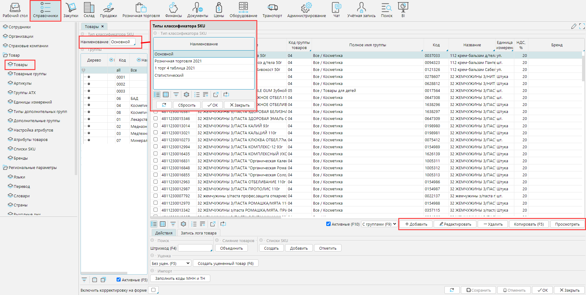 На форме Справочники - Товары отображаются товары, введенные в систему. В левом блоке Группы отображаются группы выбранного товарного классификатора. Основной товарный классификатор создается на форме Товарные группы, остальные типы классификаторов формируются на основании введенных в систему данных. В правом блоке Товары отображаются товары выбранной в левом блоке группы.