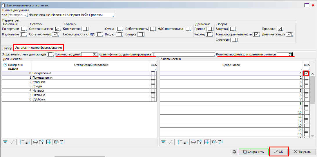 Если одновременно отмечены и дни недели и числа месяца, то отчет будет формироваться в те числа, которые совпадут с днями недели.