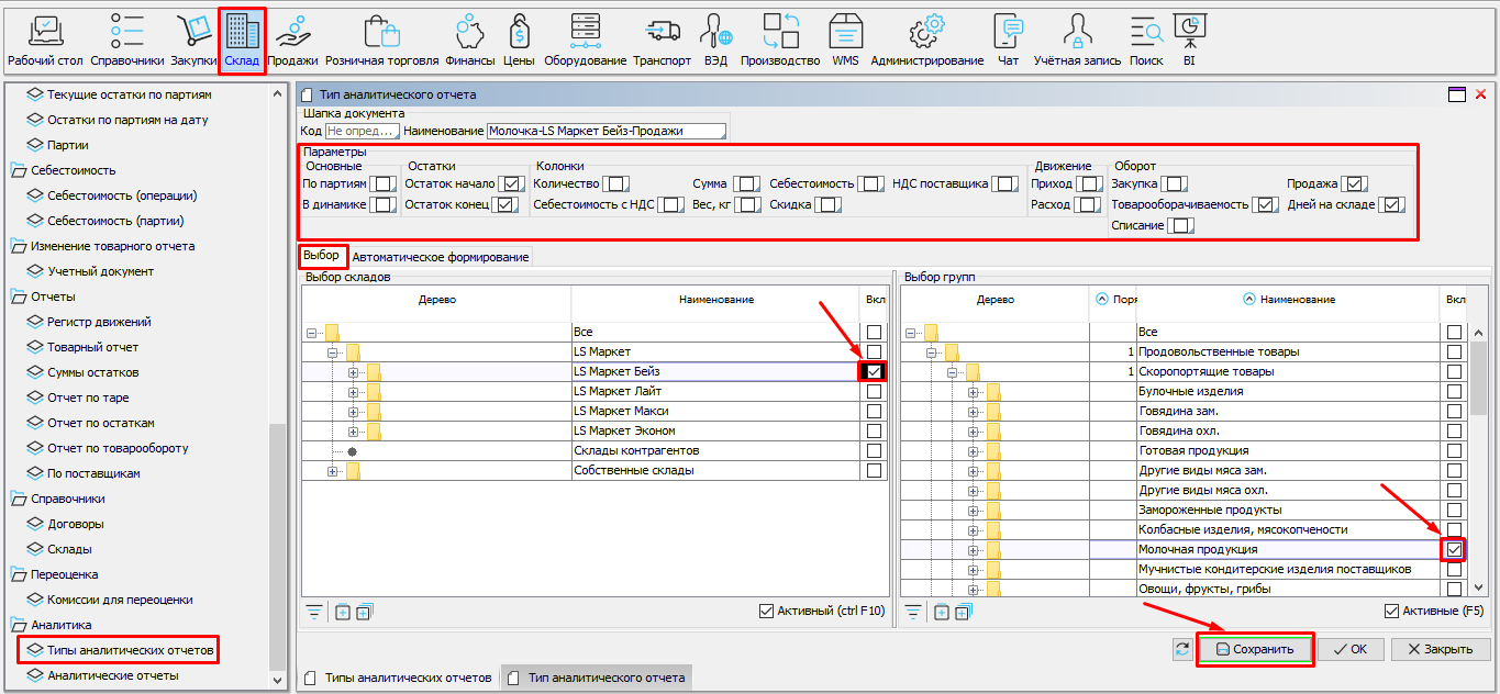 На форме Склад\Аналитика\Типы аналитических отчетов можно настроить любое количество типов отчета. Тип отчета включает в себя: