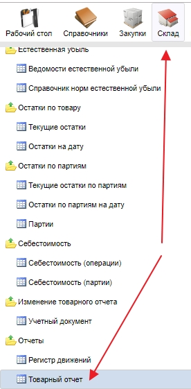 Товарный отчет формируется на форме *Склад - Товарный отчет *