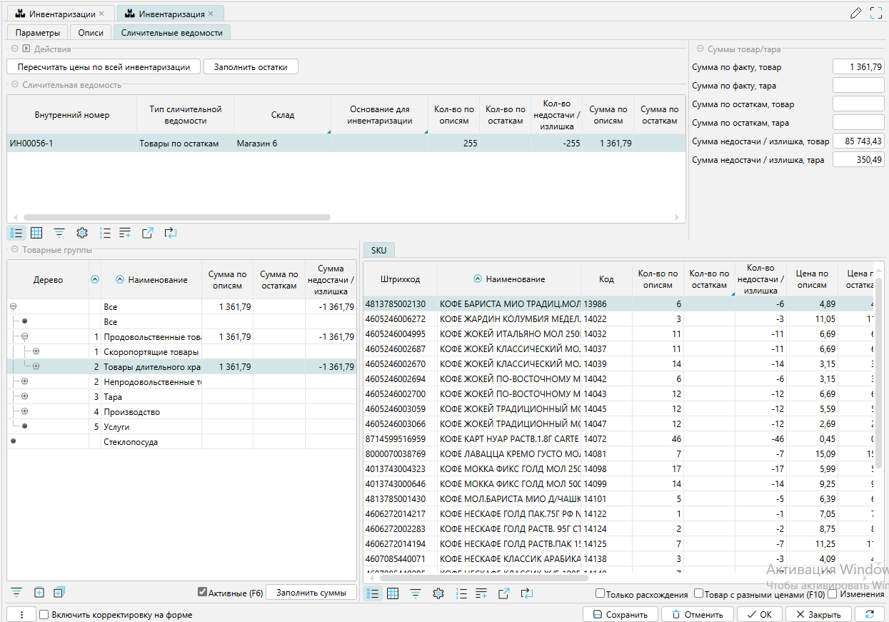 Инвентаризация в пределах одной группы товаров (в соответствии с описями с остатков списывается недостача, на приход ставится излишек)