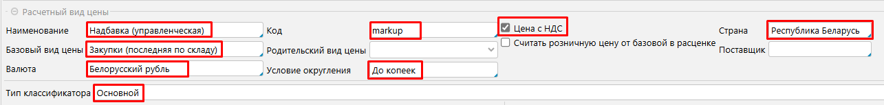 Заполняем атрибуты и настройки Расчетного вида цены: