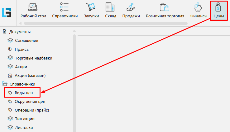 Для этого заходим на форму Цены\Справочники\Виды цен