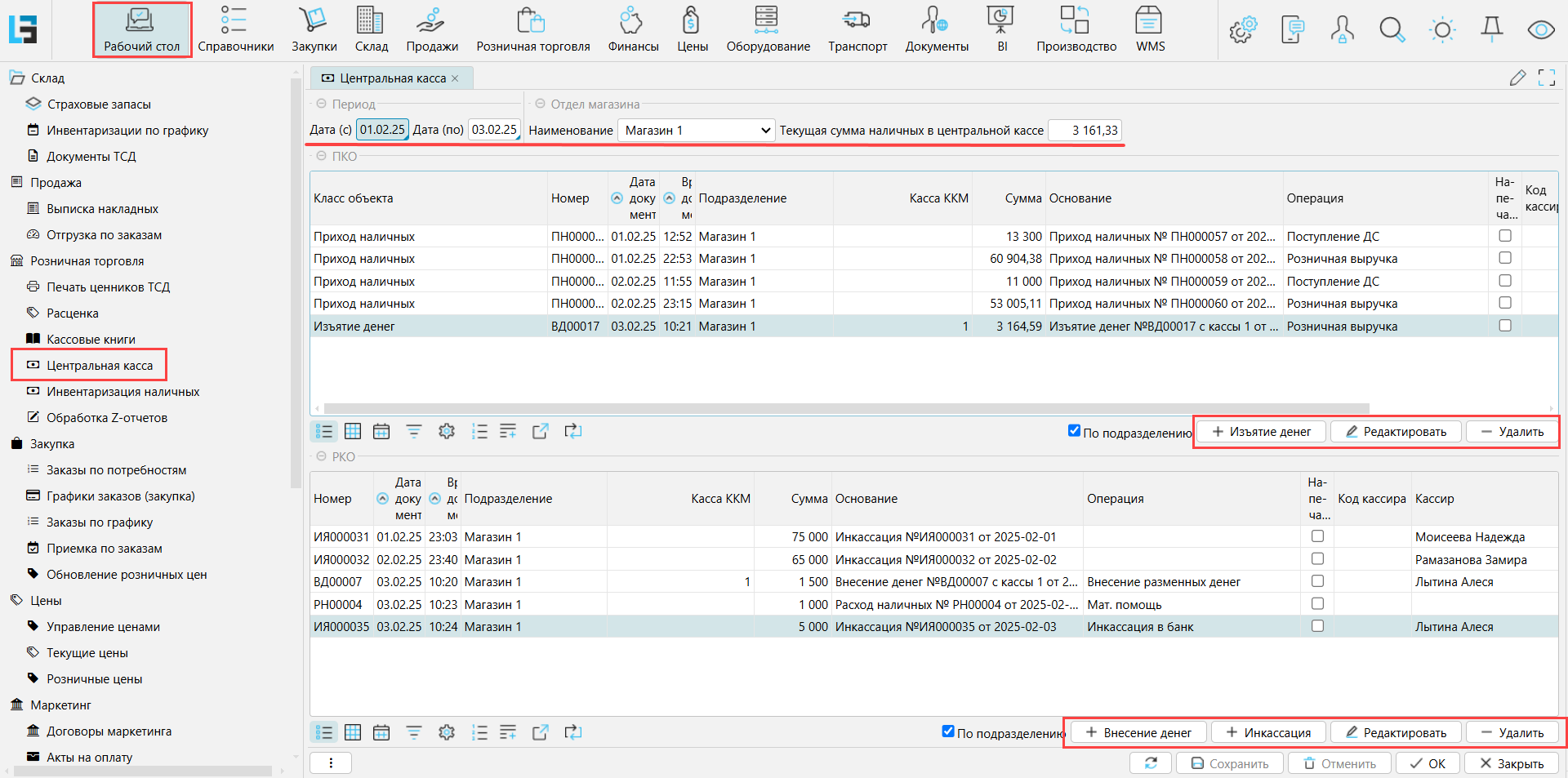 В верхней таблице, ПКО, отображаются все документы прихода за период. Есть возможность создать изъятие денег и отредактировать документы из списка.