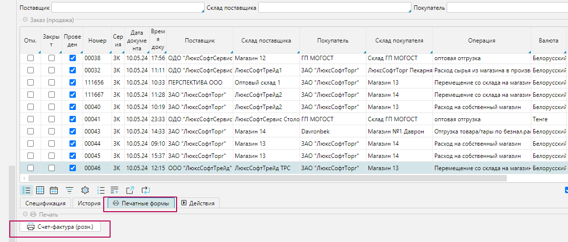 Для распечатки печатной формы, переходим в закладку Печатные формы и нажимаем кнопку доступной печатной формы.