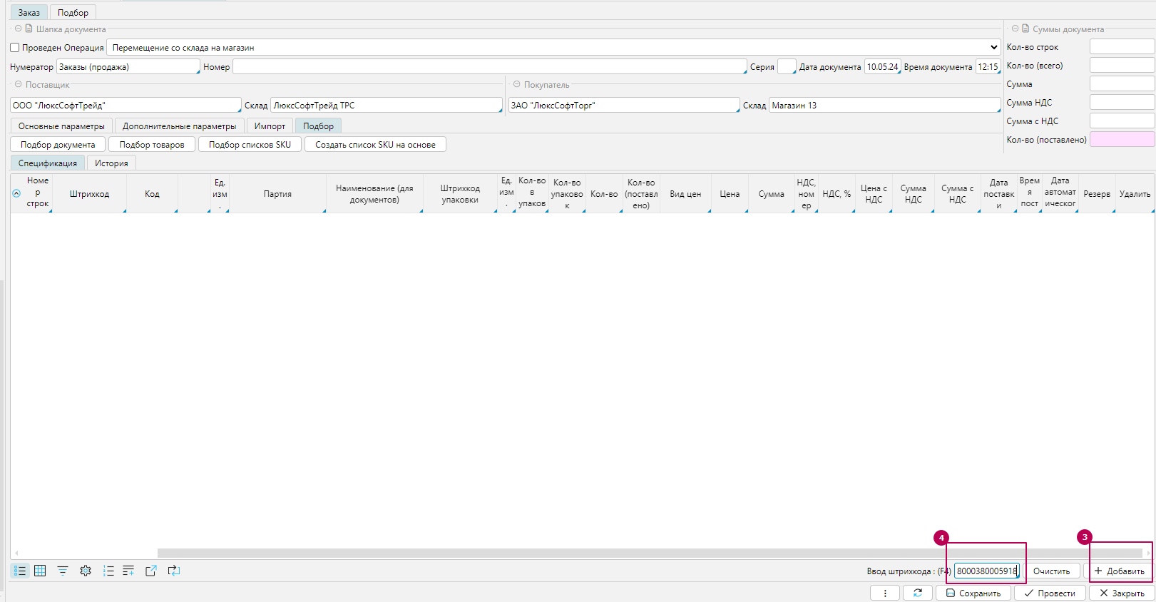 - Заполняем **Склад Поставщика **- склад, с которого отписываем товар