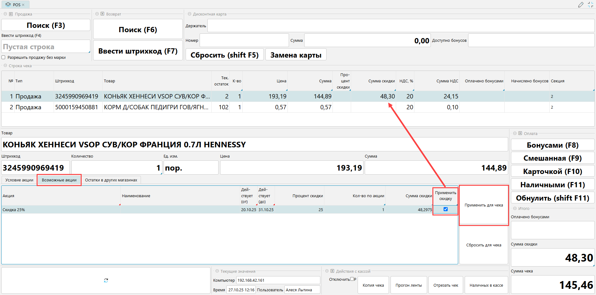 В системе можно настраивать акции, которые кассир применяет вручную. Если к товару применима такие акции, то они отображаются на вкладке Возможные акции. Чтобы применить акцию к конкретному товару, нужно на вкладке Возможные акции установить флажок Применить скидку. Скидка отобразится в товарной строке.