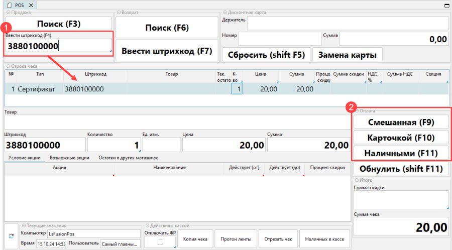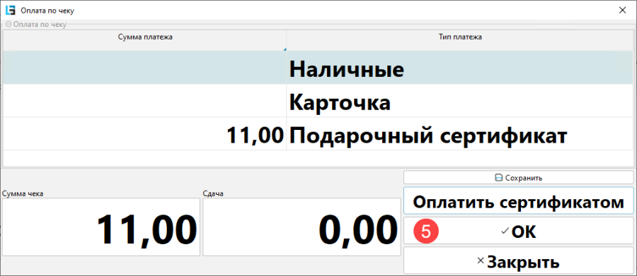 При оплате чека подарочным сертификатом (рис. 12, 13):