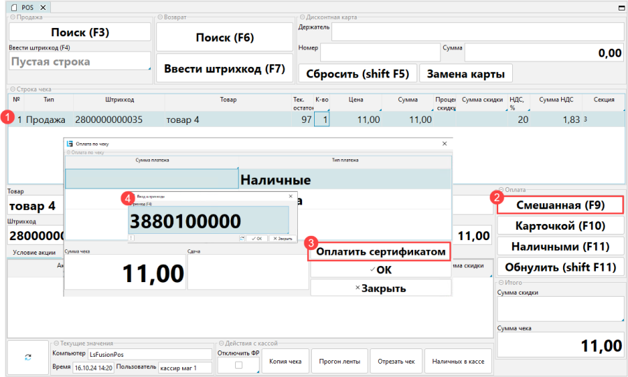 Чтобы продать подарочный сертификат (рис. 11) нужно отсканировать номер сертификата, или ввести его вручную в поле Ввести штрихкод. Далее принять оплату одним из способов.