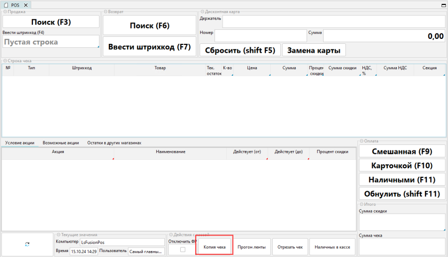По кнопке Сбросить для чека, скидка по выбранной акции будет аннулирована для всех позиций в чеке, для которых была применена.