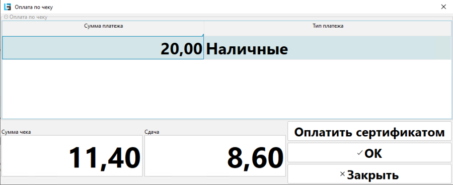При выборе формы оплаты Наличными или F11 программа откроет окно оплаты. В поле Сумма платежа нужно ввести сумму наличных, которые передал покупатель. Если сумма больше суммы по чеку, то программа отобразит сумму сдачи в поле Сдача. После расчета с покупателем нажмите ОК и платеж будет зарегистрирован.