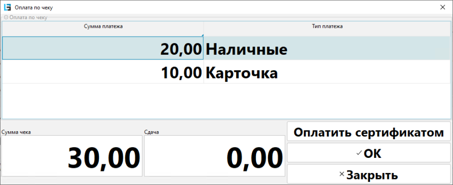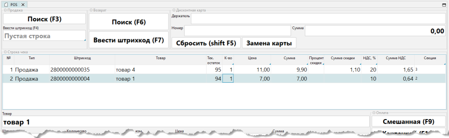 - Смешанный платеж осуществляется наличными и карточкой. Нужно нажать кнопку Смешанная или F9. Ввести сумму платежа наличными и картой, нажать ОК.