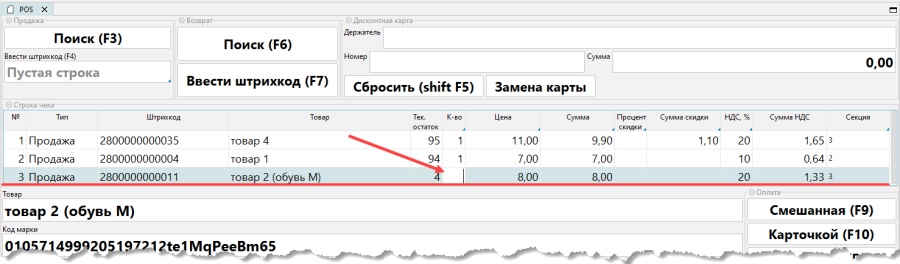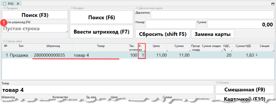 Чтобы удалить позицию в чеке нужно удалить количество по позиции и нажать клавишу Enter (рис. 3). Строка чека будет удалена (рис. 4).