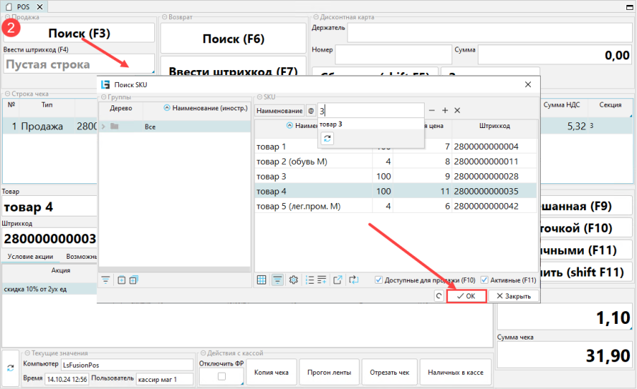 - Кассир добавляет позиции в чек