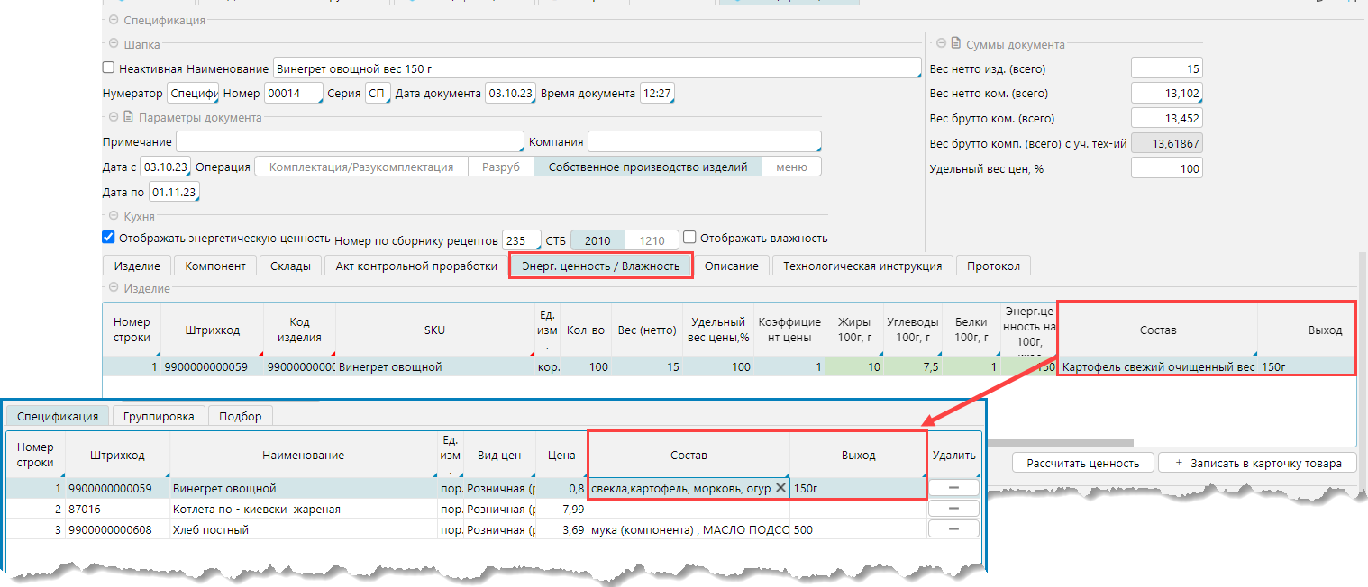В спецификации меню могут быть заполнены поля Состав и Выход для каждого блюда. Эти данные отображаются в печатной форме меню.  Данные заполняются в соответствии с производственной спецификацией готового изделия: на вкладке Энергетическая ценность должны быть заполнены Состав и Выход.