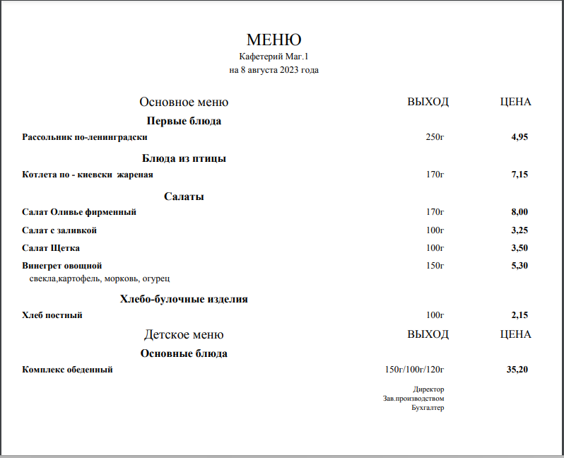 Модуль "Собственное производство" предоставляет возможность автоматически формировать и печатать меню вашего заведения.
