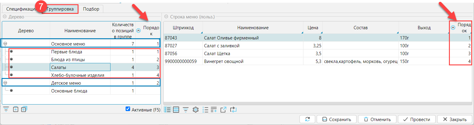 В блоке Дерево в столбце Порядок целыми числами устанавливается порядок отображения групп и подгрупп, если необходимо, чтобы блюда также отображались в определенном порядке, то по каждой группе меню в блоке Строка меню в столбце Порядок нужно указать порядок отображения для блюд.